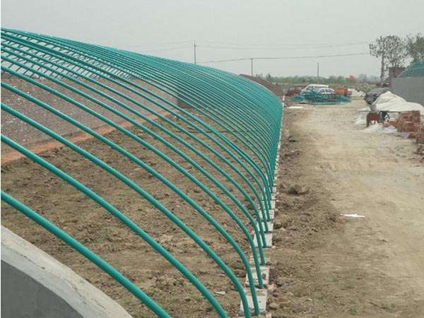 日光溫室采用熱鍍鋅鋼主體骨架鋼管制成拱弧形屋架,根據跨度不同有室內無柱或只有單排柱結構,骨架桿件之間均采用螺栓連接。溫室每隔3米設一榀組合主骨架,每兩榀主骨架之間設兩榀副管拱架,主骨架與副管拱架之間設有橫向連接構件。整體結構堅固耐用,抗風雪荷載能力強。覆蓋材料選用具有長壽命、防老化性能好、透光率高、防塵、防滴的復合功能膜及嚴寒冬天配合具有防水、防老化,高蓄熱保溫材料組成的復合保溫被覆蓋,其保溫性能優(yōu)于草簾,卷放省力省工,是目前日光溫室的外保溫材料。